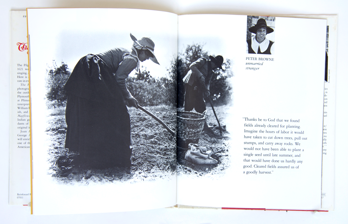 The First Thanksgiving Feast was photographed at Plimoth Plantation, the outdoor living history museum at Plymouth, Massachusetts. The people at Plimoth Plantation, who are called interpreters, impersonate Governor William Bradford, Captain Myles Standish, and the other Pilgrims from the Mayflower. Chief Massasoit and the Indian guests at the feast are descendants of the Wampanoag nation, the original inhabitants of the area.