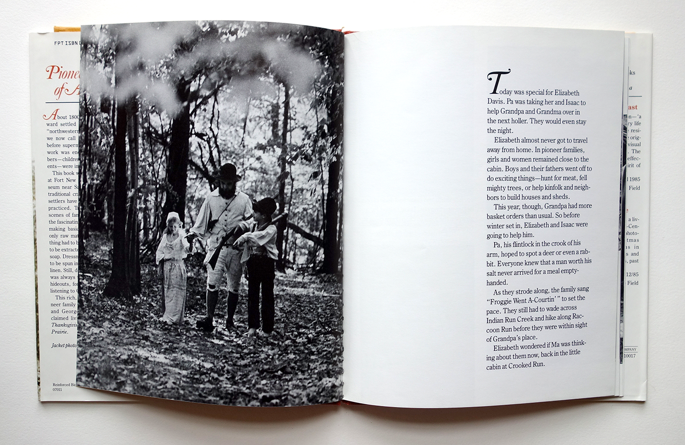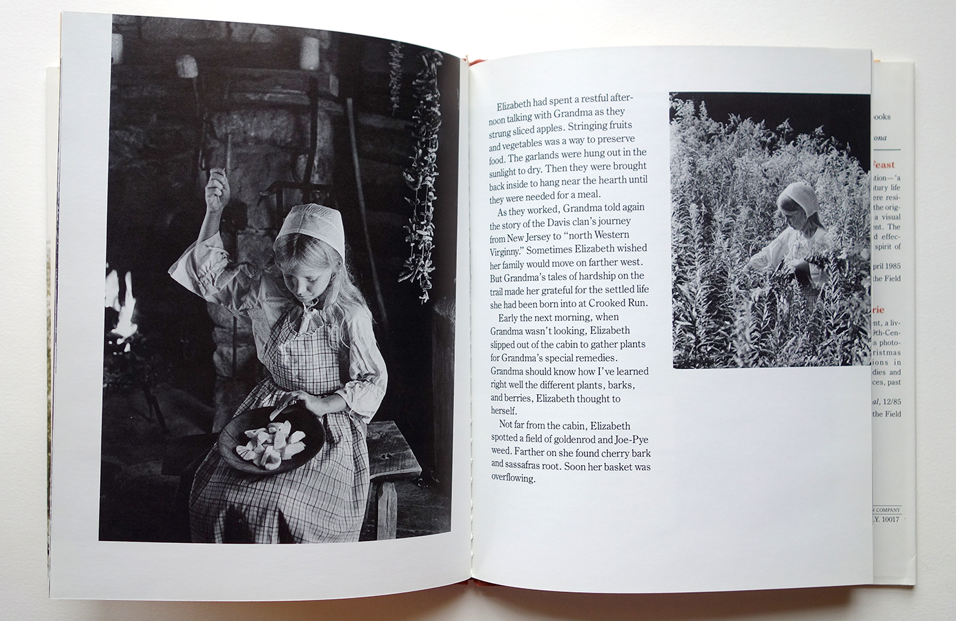 This book was photographed on location at Fort New Salem, a living history museum near Salem, West Virginia. There, traditional crafts and trades of the early settlers have been preserved and are still practiced. Trained interpreters reenact scenes of family life as they demonstrate the fascinating processes pioneers used for making basic household items. Because only raw materials were available, everything had to be made from scratch. Lye had to be extracted from ashes in order to make soap. Dressmaking began with picking flax to be spun into thread and then woven into linen. Still, despite the endless work, there was always time for playing in corn shock hideouts, for dancing and singing, and for listening to Grandma’s stories of long ago.