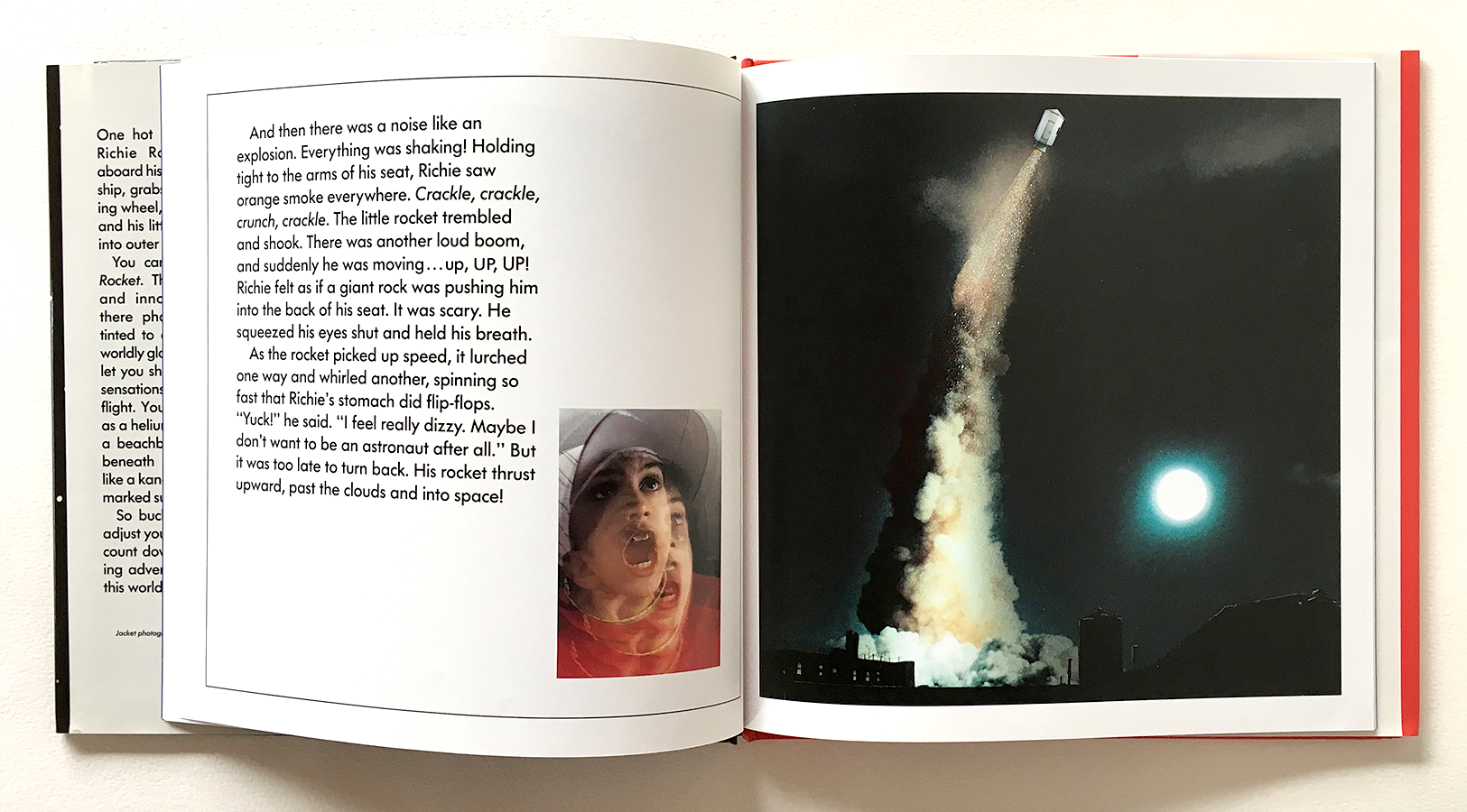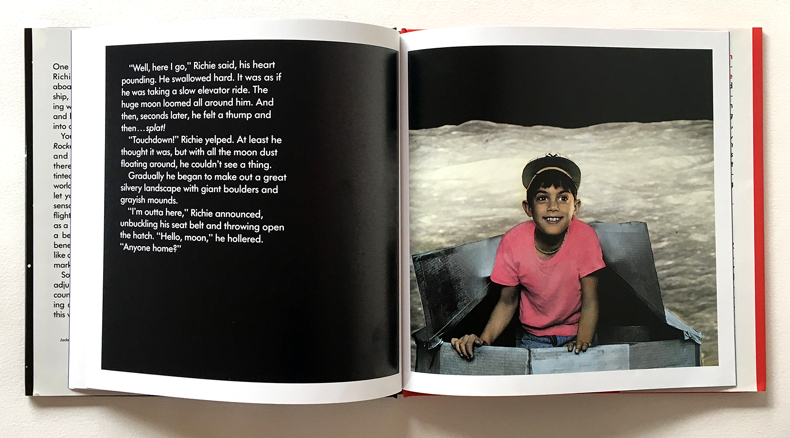 You can, too, in Richie’s Rocket. The energized text and innovative, you-are-there photographs–hand tinted to capture the other-worldly glow of outer space–let you share the sights and sensations of a real space flight. You’ll float weightless as a helium balloon, gaze at a beachball-sized Earth far beneath you, and bounce like a kangaroo on the pockmarked surface of the moon.