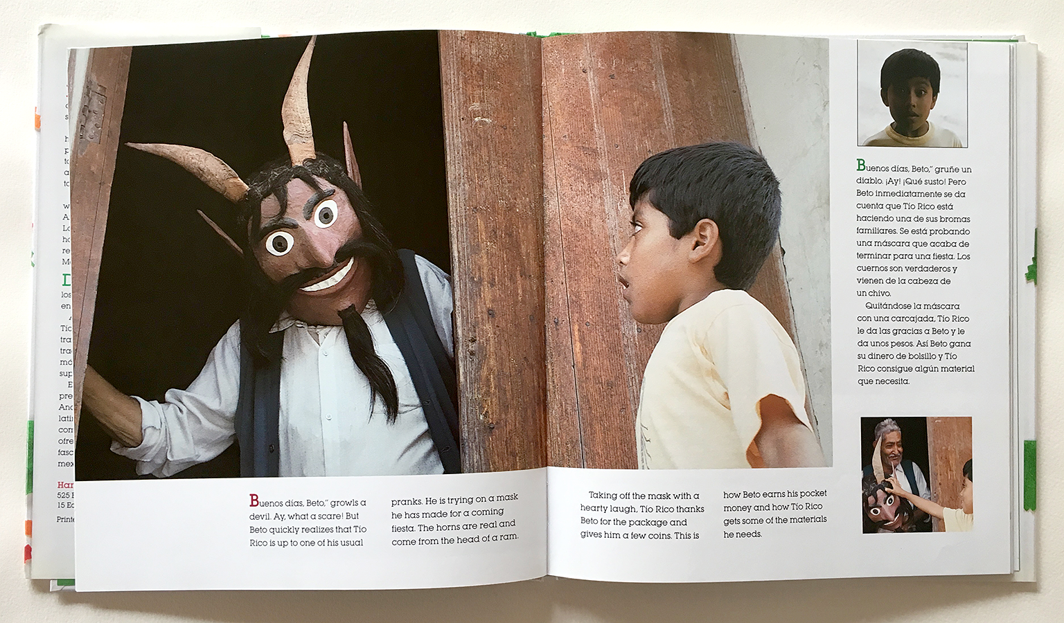 “Writer-photographer Ancona takes children to a Mexican village to meet Tío Rico, an old man who makes beautiful piñatas, puppets, and masks for parties and festivals. Exceptionally clear and well composed, the full-color photographs bring the village, the people, and the craft of piñata-making sharply into focus. On each page, the text appears in English, then in Spanish. Clearly written in both languages, the English/Spanish dual text provides a good bridge for children neither learning a second language, as well as making the book accessible to those who know one or the other. Not just a how-to manual, the book has a narrative strand, following Tío Rico as he buys the materials for his crafts, makes them, sells them, and finally attends a party where the children break open a piñata. A delightful introduction to the subject and a memorable glimpse of one Mexican village and its people.”