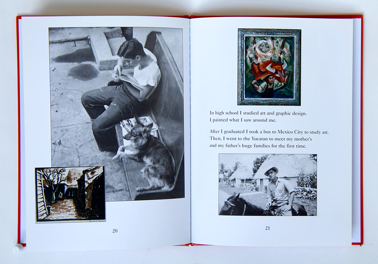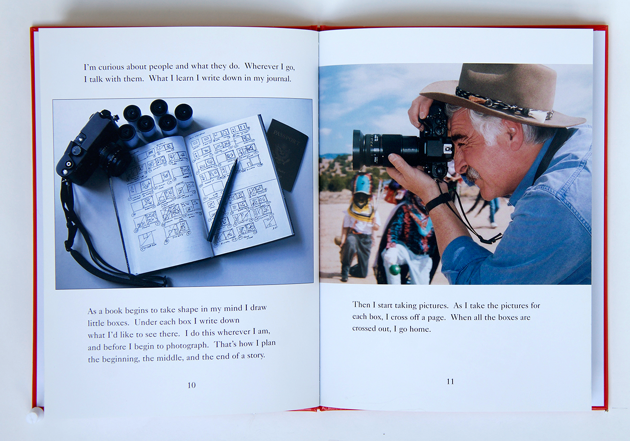 Photographs of the author/photographer invite the reader to visit the author at his home and studio in Santa Fe, New Mexico. There he describes the process of writing and putting together the photographs for a children’s book. Photographs from his family album show the journey of his parents from the Yucatan in Mexico to New York where he was born and grew up. He talks of the influences in his life and shows some of the people he has gotten to known in his travels around the world to make books.
